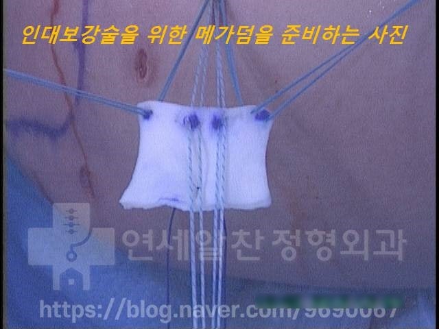 안타깝게도 이 환자의 경우 초기 회전근개파열 진단이 제대로 되지 않아 이미 인대가 많이 손상되어 약화된 상태였습니다. 그래서 퇴행성 변화로 약해진 인대를 보강하기 위해 메가덤(인조인대)를 이용해 보강술을 추가로 진행할 수 밖에 없었습닌다. 이렇게 인대가 약해진 상태일 경우 봉합술을 해도재파열되기 쉬워, 메가덤을 이용해 안정적으로 봉합하는 것이 효과적이기 때문입니다. 쉽게 말해 옷에 구멍이 생겼을 때 새로운 천을 덧대면 다시 쌩쌩하게 원상복귀 되지만 실밥이 풀리고 옷이 헤진 상태에서 다시 꿰맬 경우 이미 실이 늘어나고 풀린 상태기 때문에 금방 다시 구멍이 생기는 것과 같습니다.