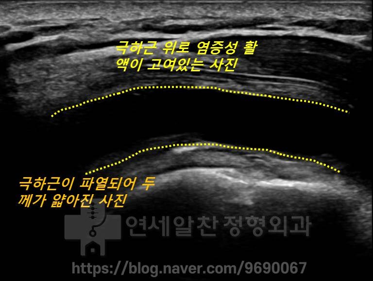 극상근의 초음파 검사상 전층으로 파열되어 완전히 단절된 모습이 관찰되었고 그 사이로 엄청난 양의 염증성 활액이 관찰되었습니다. 다량의 염증성 활액으로 인해 통증이 극심하고 팔을 제대로 쓸 수 없어 어깨 기능이 제한된 상태였습니다.