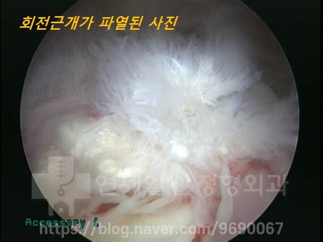 실제 관절경 사진에서 어깨회전근개파열이 심하게 진행되어 퇴행성 변화가 진행된 것을 확인할 수 있었습니다.