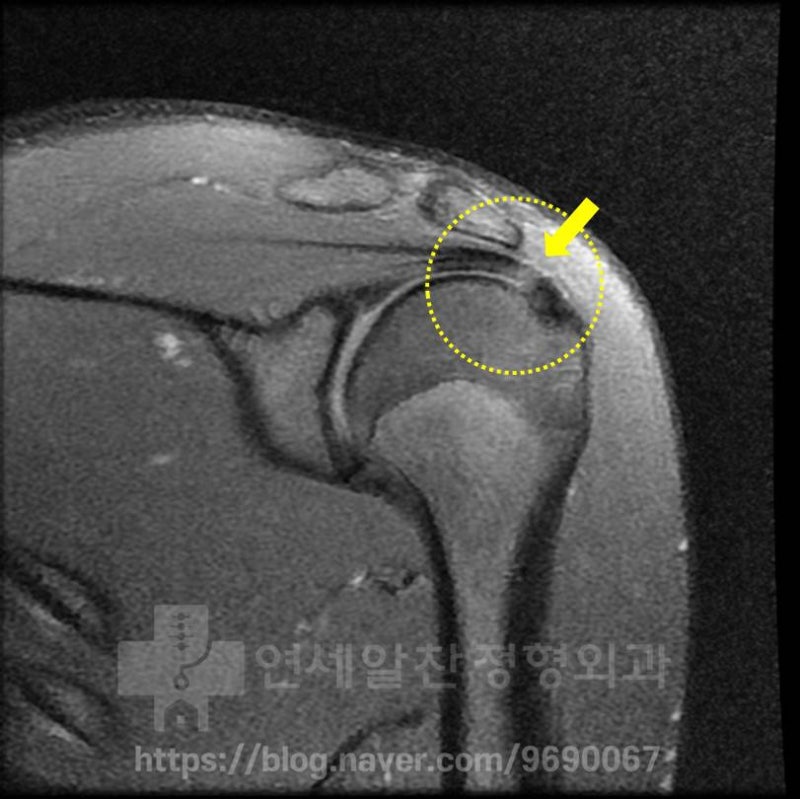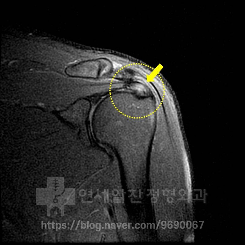 이 초음파 사진은 극상근의 단면을 찍은 사진으로 위의 사진과 마찬처럼 노란 점선안의 화살표로 표시된 부위에 석회가 관찰되며 그 주위가 검게 변한것이 관찰됩니다. 즉 이 환자의 경우 미세한 석회로 인한 극상근의 염증이 심하게 있었던 것으로 판단되었으며 충격파 치료 5회 정도 시행 후 증상이 호전되었습니다. 이렇게 미세한 석회가 있는 경우 X-ray 에서 관찰되지 않는 경우가 많으며 MRI 의 경우 4mm 단위로 검사가 진행되기 때문에 4mm 보다 작은 석회의 경우 발견하지 못하는 경우가 있습니다. 초음파의 경우 시술자가 기기를 움직이면서 인대전체를 실시간으로 검사하기 때문에 초음파의 해상도가 좋고, 시술자의 경험이 풍부하다면 MRI가 아닌 초음파를 통해 어깨 석회성건염을 찾아내어 구체적인 치료가 진행될 수 있습니다. 다른 환자의 경우도 보겠습니다. 이번에 말씀드릴 환자의 경우 MRI 검사 후 인대가 파열 되었다는 이야기를 들었고 수술을 권고 받은 경우입니다. 환자는 수술적 치료를 하기전에 다시 한 번 확인하고자 본원으로 내원하였습니다. 그럼 X-ray 와 MRI 를 살펴보도록 하겠습니다.