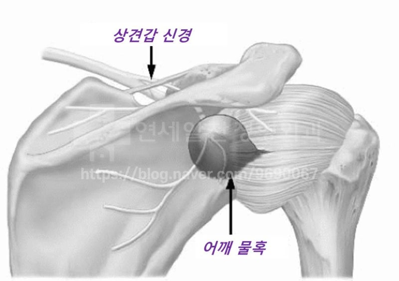 우선 어깨 물혹이란 견갑와 낭종이라 하는 견갑골에서 상견갑 신경이 지나는 부위에 물혹이 발생한 것을 뜻하며 그림과 같이 상견갑신경이 지나가는 부위에 어깨 물혹이 발생하게 되면 이 신경이 지배하는 극상근과 극하근의 위축 및 약화가 발생하게 되며 어깨 뒤쪽 및 상완부로 저림증상 및 통증이 나타나게 됩니다. 그럼 이러한 어깨 물혹은 어떻게 발생하게 되는 것일까요? 이유없이 발생되는 경우도 있으나 대부분의 경우 어깨 관절와순 파열로 인해 관절액이 빠져나오면서 발생되는 경우가 많습니다. 가장 흔하게는 상부관절와순의 손상(SLAP, 슬랩)이 있는 경우 견갑와 낭종이 동반되는 경우가 종종 있습니다. 그렇다면 어깨 물혹이 있을 때 치료는 어떻게 할까요? 단순 물혹인 경우에는 물혹만 제거하여 신경을 압박하는 것만 해결해 주면 됩니다. 이때 어깨 물혹 제거 수술은 필요치 않으며 주사기를 통해 흡입 해주면 됩니다. 하지만 어깨관절와순 파열이나 슬랩(SLAP) 을 동반하였을 때는 어떻게 할까요? 어깨관절와순 파열이나 슬랩이 치유되지 않았을 경우에는 낭종을 제거하면서 관절와순을 봉합을 해주는 수술적 치료가 필요합니다. 물혹을 주사기로 제거하더라도 관절와순의 치유가 되지 않았다면 다시 재발될 확률이 높기 때문입니다. 하지만 관절와순의 손상이 미미하거나 치유가 된 상태의 어깨 물혹을 주사기로 흡입을 한 후 적절한 치료를 한다면 매우 좋은 결과를 가져올 수 있습니다. 이것을 확인하기 위해서는 면밀하게 MRI 를 관찰해야 하며 정확한 이학적 검사를 해야 합니다. 그러니 무조건 어깨 물혹 제거 수술을 하는 것은 좋지 않습니다. 환자 케이스를 살펴보겠습니다. 환자는 헬스 운동 후 통증이 발생되었으며 약 1년동안 어깨 통증 및 어깨 주위 저림증상, 근력약화의 증상을 호소하는 환자였습니다. 다른 병원에서 수차례의 주사치료(스테로이드 주사)를 받았지만 잠깐 증상이 좋아질 뿐 점점더 증상의 악화가 있다고 하였습니다. 그래서 수술적 치료를 하자는 이야기를 들었고 이에 대해 다시 확인을 받고자 본원으로 내원하였다고 하였습니다. 타원에서 촬영한 MRI 를 살펴보겠습니다.