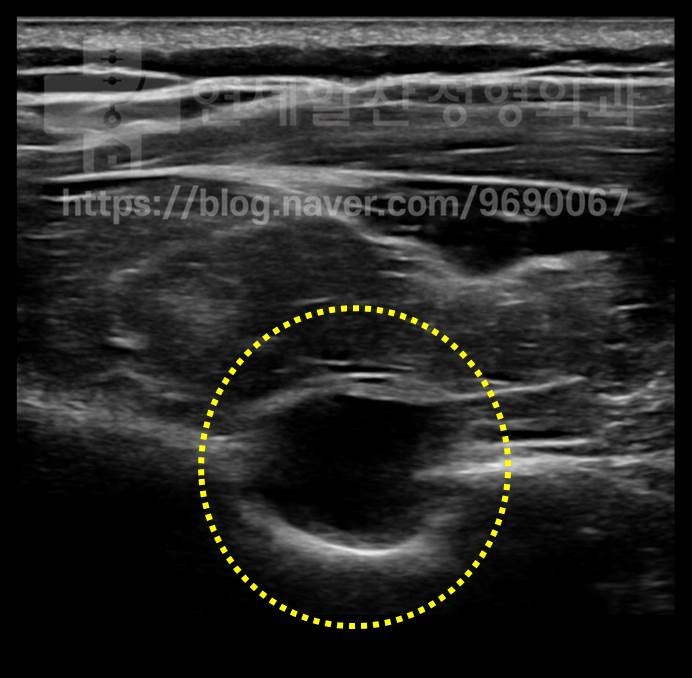 초음파상 노란색 원 안의 검은 부분이 물혹입니다.