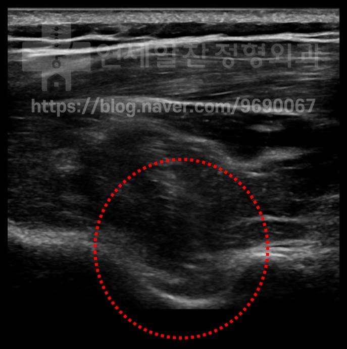 어깨 물혹을 주사기로 흡입한 사진입니다. 이 후 환자는 증상이 매우 좋아졌으며 점짐적인 재활 운동을 통해 근력도 많이 회복되었습니다. 1년 후 초음파 검사를 다시 하였습니다.