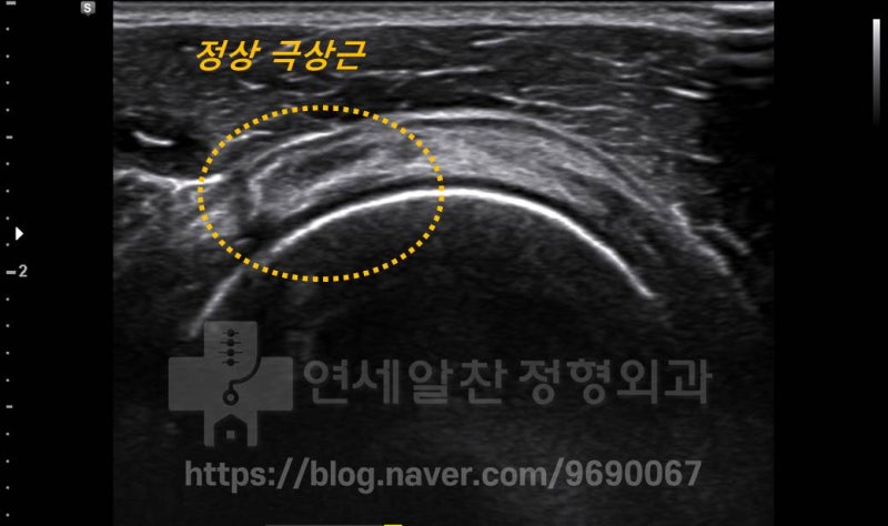 초음파에서 정상적인 극상근 부위를 관찰하였습니다. 둥근 점선 내로 정상적인 극상근의 형태가 관찰됩니다.