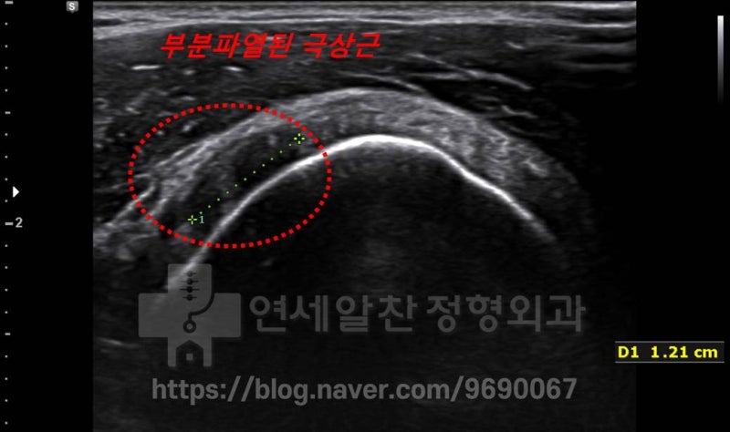 극상근의 원위부로 초음파를 이동하였을때 약 1.21 cm 크기의 부분 파열이 관찰됩니다. 상기의 상태를 종합적으로 판단하였을때 크기는 1.21cm 정도이나 관절내측 파열이며 전체적인 인대 상태는 좋은 것으로 판단되어 수술적 치료 보다는 보전적 치료로도 손상된 어깨회전근개파열을 치료할 수 있을 것으로 판단하였습니다.