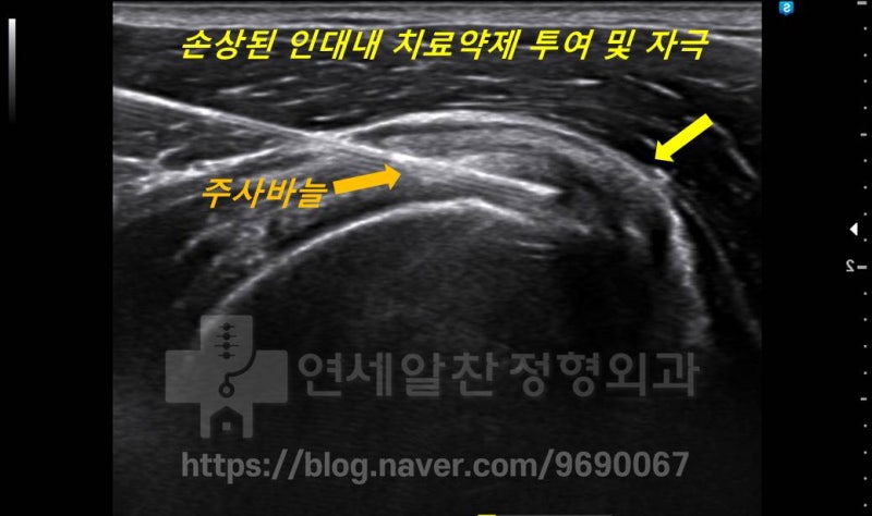 인대강화 주사를 시행하였으며 PDRN 제제 와 콜라겐 성분 제제를 사용하여 총 5회의 치료를 시행하였습니다. 상기의 초음파에서 보이듯 인대 내측으로 치료약제를 투여하고 적적한 주사자극으로 조직의 치유를 증진 시킵니다.