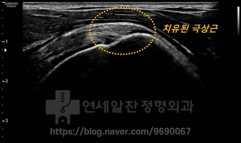 둥근 노란 점선내 극상근을 보면 어깨회전근개파열 부위가 충분히 치료된 것을 확인할 수 있습니다. 환자 역시 통증 없이 모든 활동이 가능해졌기에 치료를 종결하였습니다. 어깨회전근개파열시 보전적 치료와 수술적 치료를 모두 할 수 있습니다만 여기서 중요한 것은 어떤 것은 보전적으로 치료하고 어떤 것은 수술적 치료를 해야 하는지 정확하게 감별하여 치료에 임하는 것이 중요합니다. 수술을 해야 하는데 보전적 치료를 한다면 시간과 금전적인 낭비가 생길 수 있으며 보전적 치료로도 충분한데 수술적 치료를 하게 된다며 쓸데없이 몸에 상처만 남기는 경우가 될 수 있기 때문입니다.
