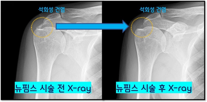 검사상 어깨 석회성 건염 이외 다른 병변을 없는 것으로 판단되어 뉴핌스 치료 (어깨 석회 분쇄 흡입술) 를 시행하였습니다.
