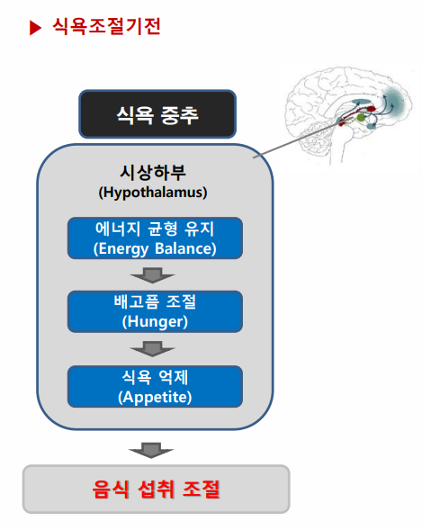 이전시간에는 식욕억제제인 펜디메트라진에 대해 알아보았습니다. 이번에는 같은 식욕억제제인 펜터민에 대해 알아보겠습니다. 펜터민은 펜디메트라진과 같이 우리나라에서 대표적인 식욕억제제 입니다. 알약의 모양이 나비 같다고 해서 일면 '나비약'으로 알려져 있기도 합니다. 식욕 중추는 뇌에서 시상 하부(Hypothalamus) 에서 관장을 하게 됩니다. 여기에서 에너지 균형을 유지하고 이를 통해 배고픔을 조절, 결국 식욕 억제를 통해 음식 섭위 조절을 하게 됩니다.