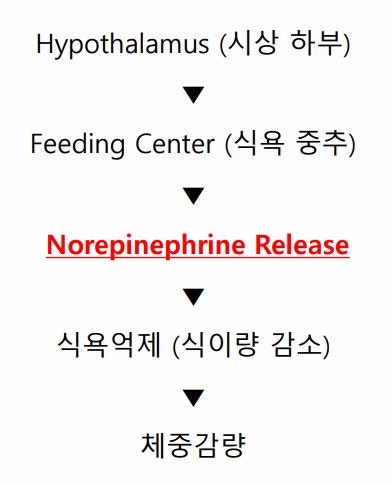 식욕조절과 관련된 신경 전달 물질은 노르에피네프린(Norrepinephrine), 세로토닌(Serotonin), 도파민(Dopamine), GABA 등이 있습니다. 이 중 노르에피네프린은 섭식 억제, 에너지 소비 증대(열발생) 에 관여하게 되며 이를 유리시키는 약물이 펜터민 입니다. 작용 기전은 펜디페트라진과 같습니다. 즉 약기기전은 노르에피네프린을 유리시켜 식욕억제를 하는 것입니다.