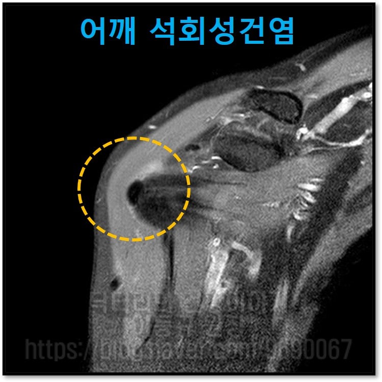 MRI 사진에서도 노란 원안에 까맣게 보이는 것이 어깨 석회성 건염으로 보입니다.
