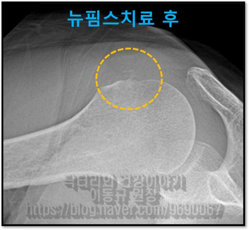 뉴핌스 치료 (석회분쇄흡입술) 후 X-ray 를 보면 시술전 보였던 석회가 거의다 제거된 것이 관찰됩니다.