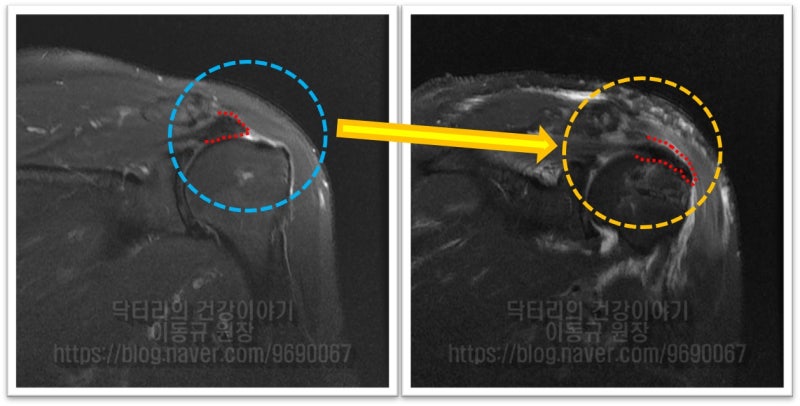 안녕하세요. 정형외과 전문의 이동규 입니다. 오늘은 회전근개 파열에서 관절경 수술시 더 단단하게 봉합하는 이열 봉합법을 시행한 케이스를 소개해 드리겠습니다. 회전근개 파열이 많이 진행 되었을때 단순히 봉합만 해서는 회전근개의 장력을 견디지 못해 재파열이 일어날 수 있습니다. 또한 파열이 된지 오래 되었다면 힘줄의 퇴행성 변화가 많이 진행되어 재파열이 일어날 수도 있습니다. 이열 봉합법은 이중으로 회전근개를 봉합하는 술기 입니다. 즉, 회전근개가 상완골에 부착되는 부위를 foot print 라 하는데 이 부위를 이차원적이 아닌 3차원적으로 면으로 봉합하는 방법이라고 생각하시면 됩니다. 보여드릴 케이스는 67세 여자환자 분입니다. 오랜 기간동안 통증이 있어 왔고 주사치료만 받았던 분이었습니다. 최근에는 주사치료에도 통증이 좋아지지 않고 일상생활도 불편해지고 밤에 잠을 자지 못할 정도로 통증이 있어 본원으로 내원하게 된 환자분입니다. 이학적 검사상 impingement sign, empty can test 양성 소견을 보였습니다.