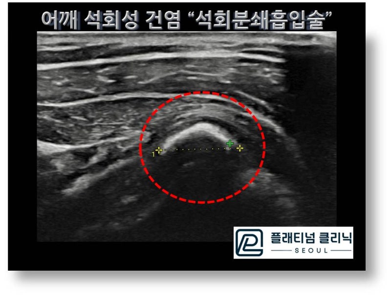 초음파 사진을 보면 빨간 원안에 하얗게 보이는 것이 석회입니다. 초음파는 고체를 투과하지 못하기 때문에 뼈 밑으로는 검게 보이게 되는데 이 석회도 단단한 석회여서 석회 밑으로 검게 보입니다. 단단한 석회지만 충분히 제거할 수 있을 것으로 판단되었고 석회분쇄흡입술을 통해 석회를 제거하였습니다.