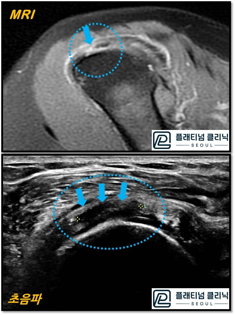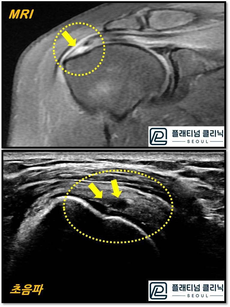 🔗 https://blog.naver.com/9690067/221417655749결론부터 말씀 드리면 회전근개 질환을 진단할 때 초음파 만으로도 충분히 진단할 수 있습니다. 우선 환자를 볼때 환자의 증상을 자세히 듣고 이학적 검사를 시행하게 됩니다. 이학적 검사를 하게 되면 어느 힘줄에, 관절 속인지, 관절 밖의 문제인지 어느정도 판단할 수 있습니다. 이러한 이학적 검사를 한 후 회전근개의 문제만 있다고 판단된다면 초음파 만으로도 충분히 진단할 수 있습니다. 물론 이학적 검사에서 관절속의 문제나 관절와순의 문제로 판단되면 MRI 검사를 해야 합니다. 초음파는 고체를 투과하지 못하기 때문에 관절속을 관찰 할 수는 없기 때문입니다. 하지만 회전근개는 뼈 위에 있는 힘줄이기 때문에 초음파로 더 정확히 진단할 수 있습니다. MRI 는 보통 4mm 단위로 잘라서 관찰을 하기 때문에 4mm 이하의 병변이나 미세한 석회는 진단하기 어렸습니다. 초음파는 실시간 동영상으로 진단할 수 있으며 연속적으로 힘줄을 관찰할 수 있습니다. 한번 비교를 해 볼까요?