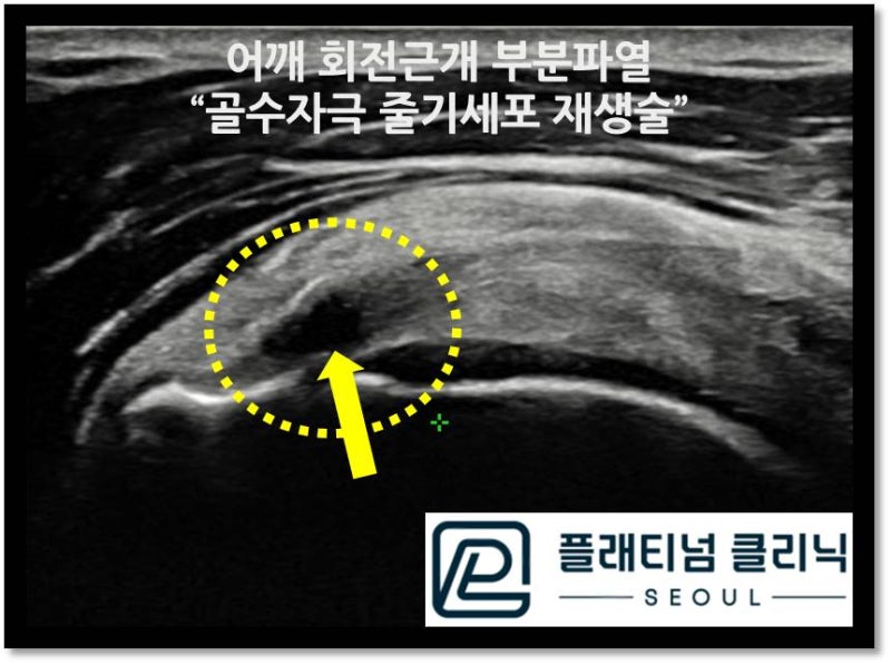 초음파 영상을 보면 회전근개는 초음파 상에서 하얗게 보이는 것이 정상입니다. 위의 사진에 보면 노란 원안에 화살표로 표시된 부위를 보면 검게 구멍나듯이 보이는 것이 회전근개의 부분파열 입니다. 관절내측 파열로 보이며 환자는 수차례의 증식치료(프롤로치료)를 했음에도 호전이 되지 않아 저한테 찾아오셨고 골수자극 줄기세포 재생술을 시행하였습니다.