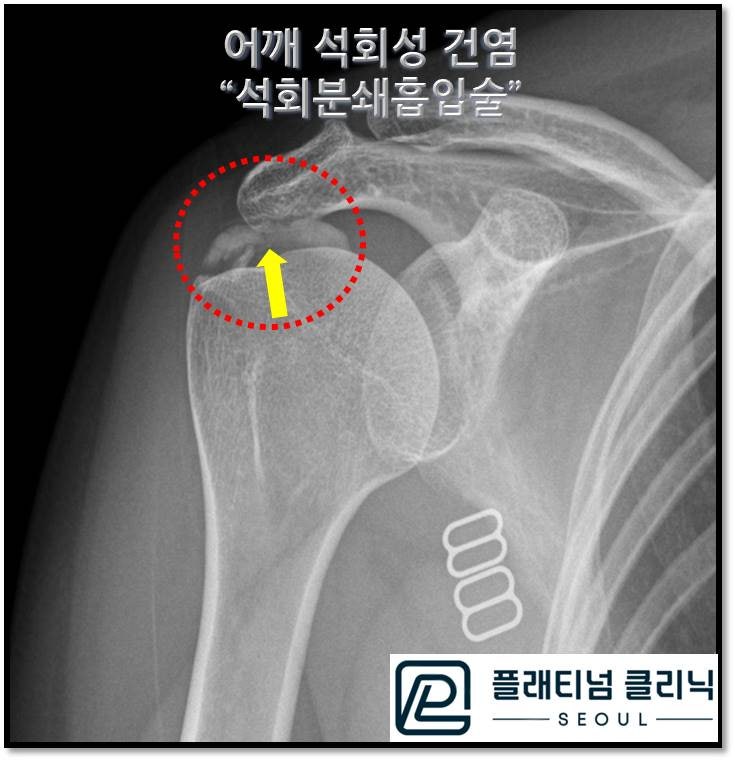 X-ray 사진을 보면 빨간 원안에 화살표로 표시된 부위가 석회이며 어마어마한 양이 관찰됩니다. 타병원에서 MRI 까지 촬영해서 오셔서 확인을 하였습니다.