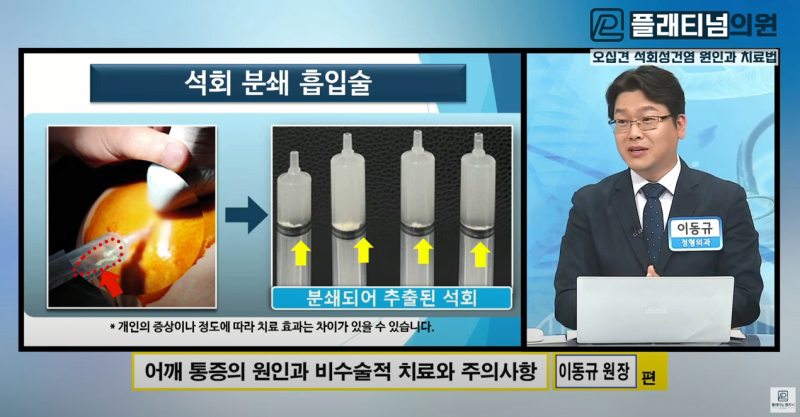 석회의 제거는 체외충격파로 힘줄의 혈류 공급을 원활하게 해주거나 사이즈가 큰 어깨석회치료는 초음파 유도하에 특수 바늘을 이용하여 딱딱하고 큰 석회질을 분쇄 하여 주사기를 이용 하여 흡입해주는 석회분쇄흡입술을 시행 할 수 있습니다. 어깨석회치료 뉴핌스치료 석회분쇄흡입술의 장점은 관절경 수술 없이도 어깨 힘줄 내에 침착되어 있는 석회를 주사기를 이용해 제거 해낼수 있다는 것입니다. 초음파를 통해 정상적인 회전근개힘줄은 건드리지 않고 석회가 있는 조직만 집중 타켓팅 하여 어깨석회치료 할수 있는것도 장점 입니다. 어깨석회치료 뉴핌스치료는 석회가 녹고 있는 급성 통증기때 시행 하면 효과적 입니다.