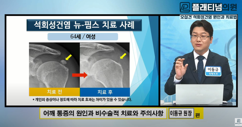 이는 운동 이외 에도 가사노동이나 직업적으로 어깨를 과하게 많이 반복적으로 사용하면서 어깨 질병을 초래할 가능성이 높아지기 때문입니다. 수많은 어깨질병 중에서도 어깨힘줄에 돌이 생기는 석회성건염은 매우 극심한 어깨통증을 일으키는 질병입니다. 어깨 석회성건염은 어깨를 감싸는 힘줄과 연부 조직에 생긴 석회가 끼이는 질병 입니다. 이렇게 힘줄사이에 끼인 석회는 주변을 자극하고 염증을 유발하고 심한 어깨통증을 만들어 냅니다. 어깨를 둘러 싸고 있는 힘줄인 회전근개에 퇴행변화나 혈류 장애로 인해 칼슘 성분이 쌓일 경우 석회성물질로 변하며 이것을 '석회'라 불리게 됩니다.