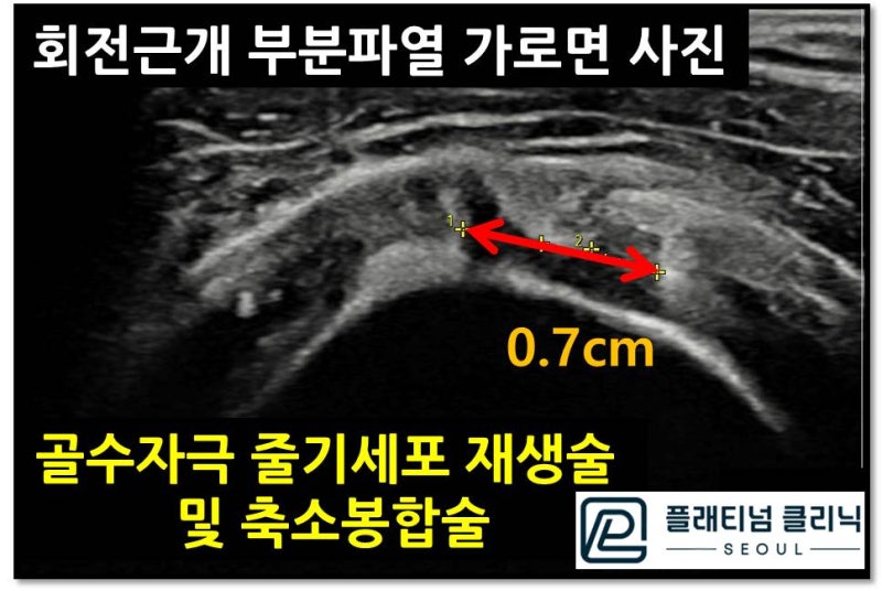 파열부위의 단면을 초음파로 본 사진입니다. 빨간 화살표로 표시된 것이 파열 크기를 나타내며 약 0.7cm 크기의 회전근개 부분파열이 관찰됩니다. 종합해 보면 회전근개(극상근) 부위에 약 0.7cm 크기의 관절내측 부분파열이 관찰됩니다. 수년간을 주사치료에도 치료되지 않고 파열의 크기가 적지 않아 보다 적극적으로 치료하기로 하고 골수자극 줄기세포 재생술 과 축소 봉합술을 시행하기로 했습니다.