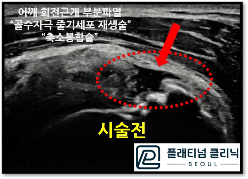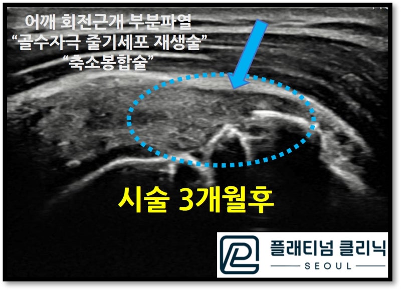 안녕하세요. 정형외과 전문의 이동규 원장 입니다. 오늘은 회전근개 파열의 비수술적 치료에 대해 케이스를 보여드리겠습니다. 회전근개가 완전파열이 된 경우에는 수술적 치료를 해야 합니다. 하지만 부분파열이 있는 경우 증식치료, 프롤로치료 등 치료약제를 이용하여 치료를 하게 되는데 파열의 양상이 좋지 않은 경우 이러한 증식치료, 프롤로치료 로 효과를 보지 못하시는 분들이 많습니다. 이런 경우 결국 시간이 지나 완전파열로 진행하게 되고 어쩔수 없이 수술을 받으시는 분들이 생기게 됩니다. 주사치료에도 효과를 보지 못하시는 환자분이나 수술적 치료를 하기에는 파열이 크지 않으신 환자분들은 정말 답답한 상황이 아닐 수 없습니다. 이러한 경우 비수술적으로 회전근개 부분파열이 치료된 방법을 소개해 드리겠습니다. 바로 골수자극 줄기세포 재생술 과 축소봉합술 입니다. 골수자극 줄기세포 재생술 https://blog.naver.com/9690067/222934136001