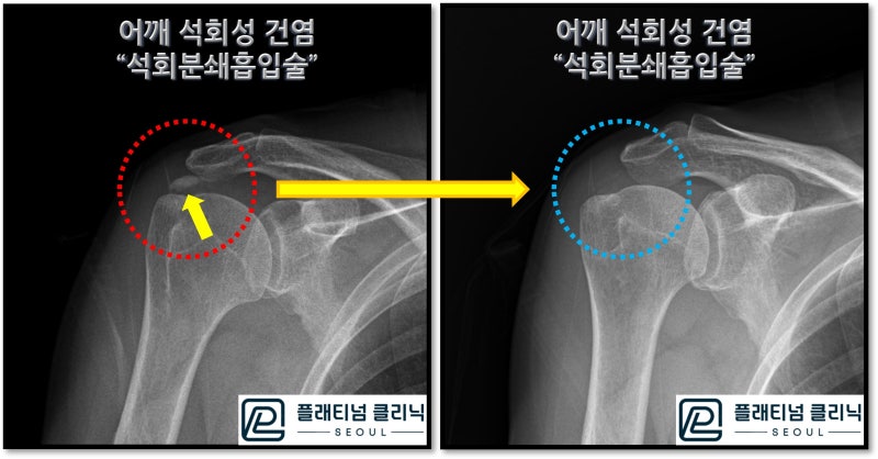 시술 전 후 사진을 같이 비교해 보면 더 명확하게 석회가 제거된 것이 관찰됩니다. 환자분은 저한테 내원했을때 통증때문에 팔도 못움직이셨는데 시술 후 웃으면서 팔도 움직여지고 통증도 엄청 줄었다며 좋아하셨습니다. 그리고 시술 전 후 사진을 보여드리면서 석회가 없어진것과 주사기 사진을 보여드리니 진작 이런 치료를 받았어야 했다면서 엄청 고마워 하셨습니다. 어깨 석회성 건염으로 고통받으시는 환자분들이 수술없이 완치될 수 있는 그날까지 열심히 노력하겠습니다 .