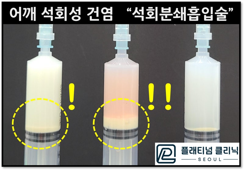 시술 후 주사기 사진을 보면 주사기 밑에 하얗게 가라앉은 것이 제거된 석회입니다. 어마어마한 양의 석회가 나온것이 관찰됩니다. 그럼 시술 결과를 볼까요?
