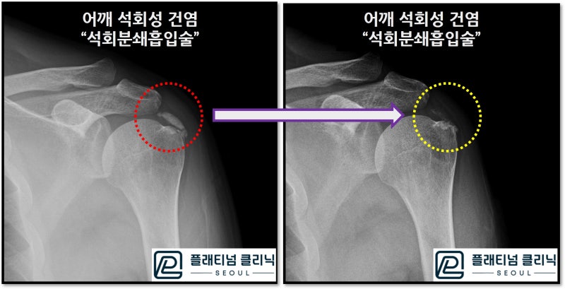 시술 후 X-ray 를 보면 처음 보이던 석회가 거의 보이지 않습니다. 거의 대부분의 석회가 제거 되었습니다. 전 후 사진을 다시 비교해 보겠습니다.