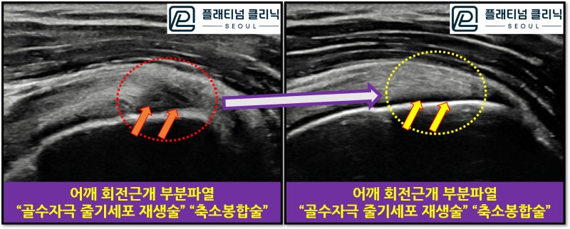 초음파 사진을 보면 회전근개는 초음파 상에서 하얗고 약간의 결이 보이는 것이 정상적인 소견입니다. 빨간 원안에 화살표로 표시된 부위를 보면 회전근개가 검게 변해 있고 중간중간 구멍이 뚫려 있듯 빈공간이 관찰됩니다. 이러한 부분파열을 치료 하기 위해 여러 주사치료를 받았으나 호전이 없던 경우 입니다. 골수자극 줄기세포 재생술 과 축소봉합술을 시행하였습니다.