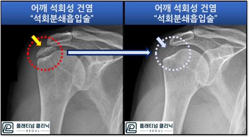 시술 전 후 X-ray 사진을 비교해서 보면 확연하게 석회가 없어진 것이 관찰됩니다.