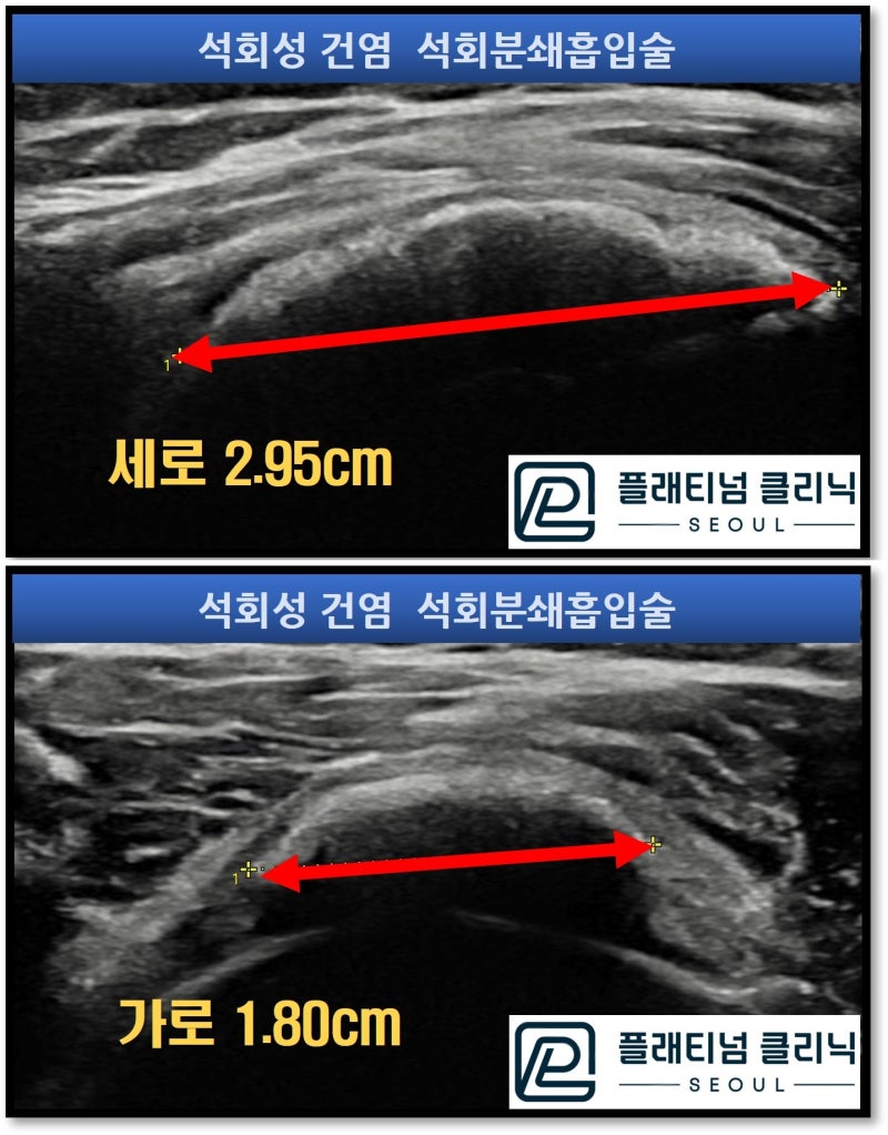 2.95*1.80 cm 의 엄청난 크기의 석회가 관찰되었으며 초음파 투과가 되지 않는 딱딱한 양상의 석회로 판단됩니다. 석회의 크기도 크고 오랜기간 고생도 하셨으며 무엇보다도 통증이 심하여 일상생활이 힘든 상태로 석회분쇄흡입술을 진행하였습니다.