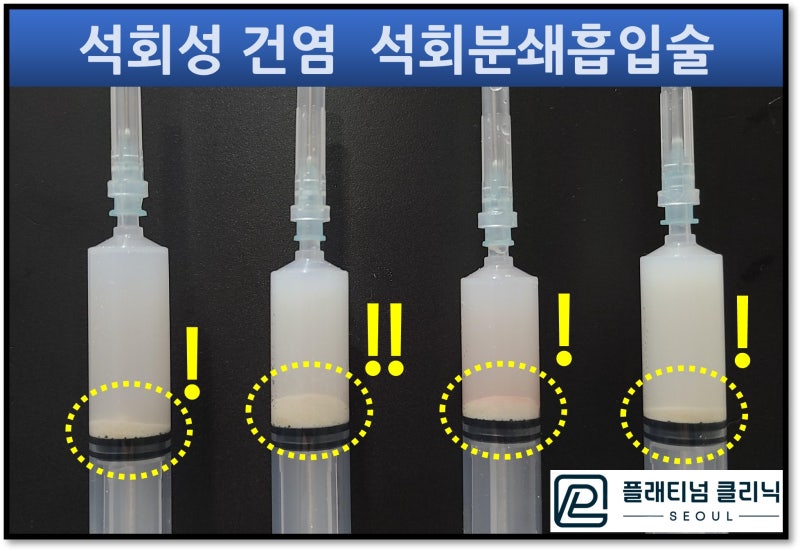 통증을 제어하기 위해 부위마취(상완신경총차단)을 한 후 수면을 통해 환자의 불안감을 없이 시술을 진행합니다. 초음파를 보면서 석회에 정확히 특수제작된 가이드를 삽입하고 특수제작된 드릴을 이용하여 내부의 석회를 분쇄합니다. 분쇄하고 난 후 멸균된 생리식염수를 주입하고 흡입하는 것을 반복적으로 하여 분쇄된 석회를 제거하게 됩니다. 제거하고 난 후 주사기 사진을 보겠습니다.