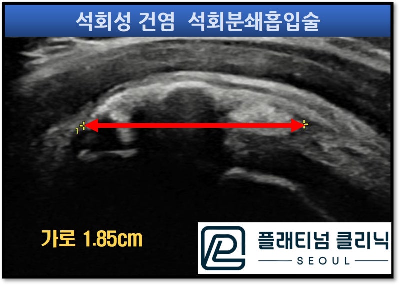 석회의 세로길이가 2.0cm, 가로길이가 1.85cm 정도 되는 커다란 석회가 관찰됩니다. 그리고 초음파상 석회의 모양이 거의 보이는 것으로 보아 찐득한 양상의 석회로 판단됩니다. 이렇게 너무 찐득한 석회일 경우 주사기의 얇은 구멍으로 석회가 빠져 나오기가 힘든 경우가 많습니다. 그래서 환자분이 이전병원에서 주사기로 석회를 흡입해내는 것이 실패했을 가능성이 있습니다. 이러한 경우 저만의 기술로 석회를 조금 묽게 만들어 주는 용액을 주사하고 특수제작된 가이드와 드릴을 이용하여 석회를 분쇄하고 흡입내 내면 석회를 잘 제거할 수 있습니다. 석회분쇄흡입술하는 초음파 영상을 보여드리겠습니다.