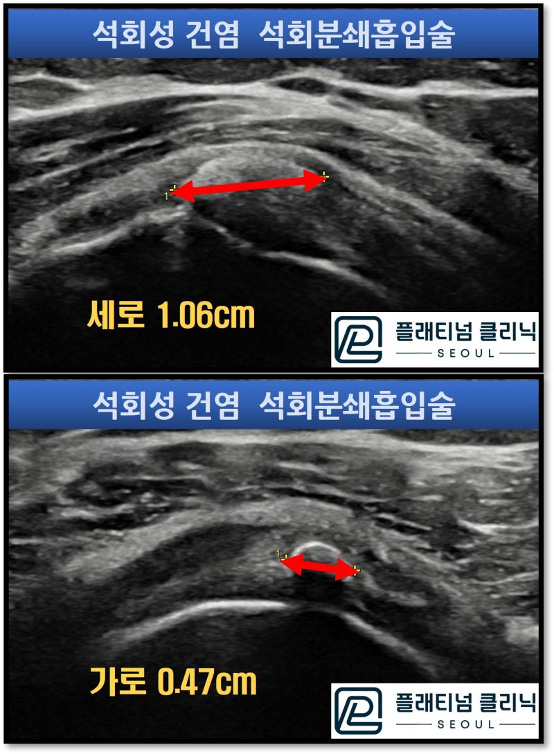 초음파상 극상근의 후방부에 위치하였으며 가로*세로 0.47*1.06cm 크기의 석회가 관찰됩니다. 석회의 모양이 보이는 부분도 있고 안보이는 부분도 있어서 딱딱한 석회와 찐득한 석회가 같이 공존해 있는 양상으로 파악되었습니다. 석회분쇄흡입술을 시행하였습니다. 시술 시간은 약 15~20분 정도 소요됩니다. 시술 후 주사기 사진을 보면