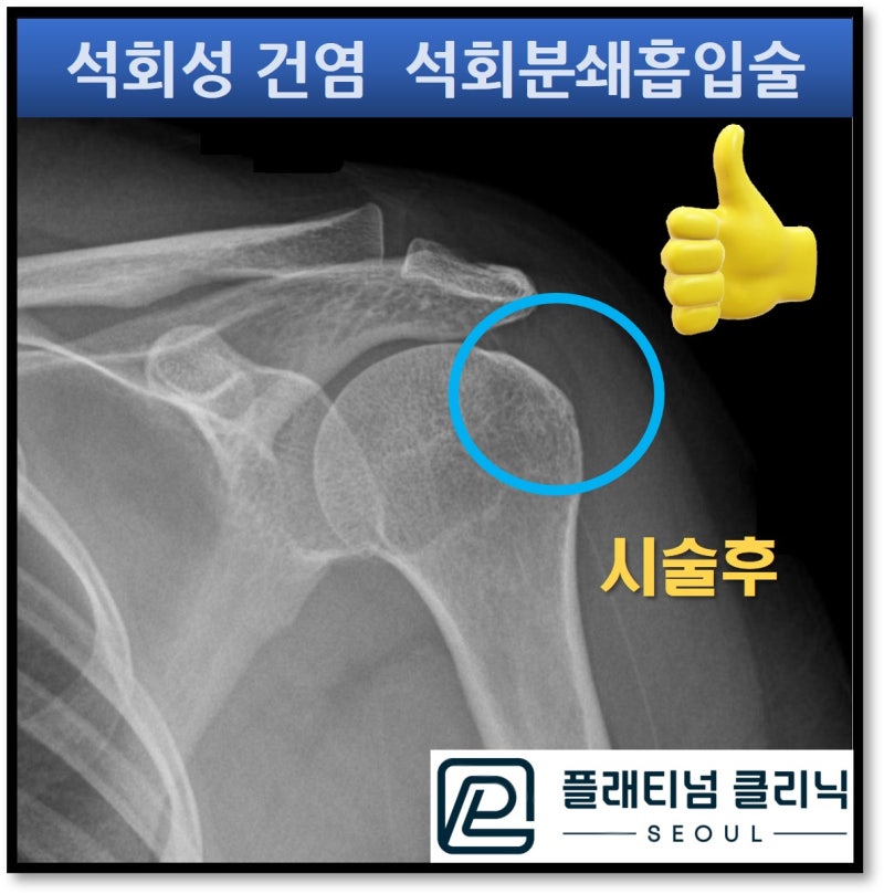 시술 후 X-ray 에서 석회가 거의다 흡수된 것이 관찰됩니다. 다시 비교하여 살펴보도록 하겠습니다.