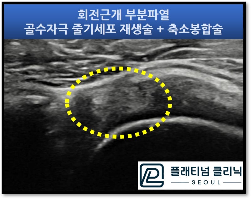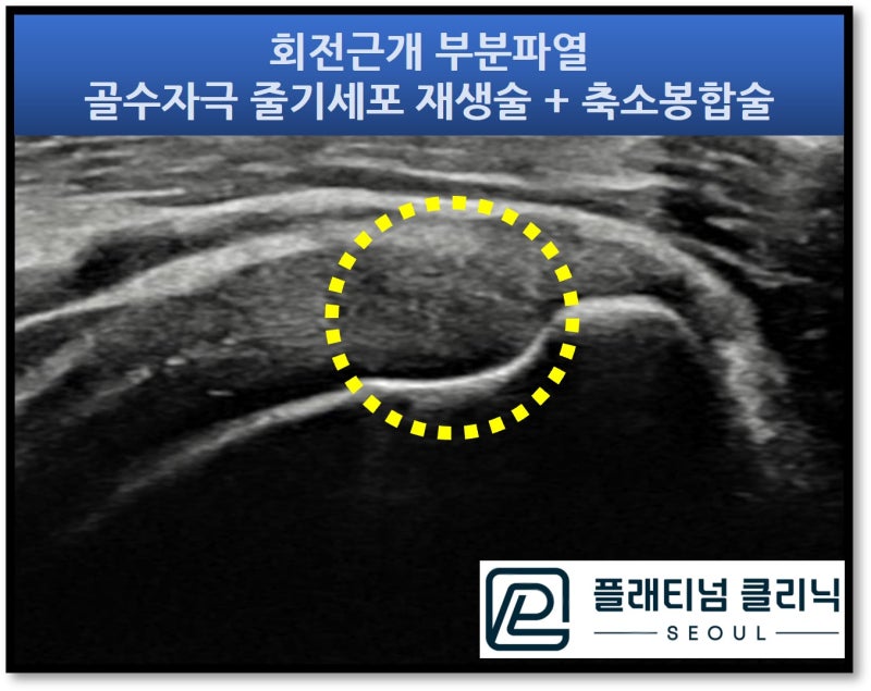 안녕하세요. 정형외과 전문의 이동규원장 입니다. 회전근개 부분파열로 이런 저런 치료를 받으시는 환자분들이 너무 많습니다. 다양한 주사치료(프롤로치료, 재생주사, 증식치료, DNA주사 등등 )를 작게는 수개월에서 많게는 수년간 받으시는 환자분들이 많습니다. 치료가 잘 되서 일상으로 복귀하시는 경우는 너무 좋습니다. 하지만 이렇게 많은 치료를 받았음에도 증상이 호전되지 않고 점점 더 악화되어 수술하시는 경우까지 발생되는 경우가 꽤 많이 있습니다. 회전근개 질환은 점점 더 진행하는 질환이기 때문에 치료가 잘 되지 않을 경우 파열은 더 진행해서 커지게 되며 완전파열이 진행된 경우에는 수술을 할 수 밖에 없는 상황까지 가게 됩니다. 저한테 오시는 정말 많은 환자분들이 오랜기간 어깨 통증에 시달리시고 주사치료를 수도 없이 많이 하시고도 증상 호전이 없으셔서 엄청 고생하셨다고 말씀하십니다. 물론 주사치료가 잘 되어서 좋아지시는 분들도 있습니다. 그렇다면 주사치료는 얼마나 해야 할까요? 일반적인 기준을 말씀드리면 증식치료(프롤로치료 등등 재생을 목적으로 하는 주사 모두를 지칭하겠습니다.)는 1주일에 1회 주사를 기본으로 하며 4~6회를 치료하게 됩니다. 모든 증식치료는 초음파 가이드 하에 이루어져야 손상부위에 정확히 타겟팅을 할 수 있음 치료 과정중에 조직이 치유되는 것 까지 확인할 수 있습니다. 모든 주사치료가 끝난 후 약 4주 정도의 조직이 치유되는 기간이 필요하며 이 기간 이후 다시 검사를 해서 조직의 치유정도를 판단합니다. 즉 증식치료 4~6회 후 4주간의 치유기간 을 생각한다면 2달 반 정도면 증식치료의 치료 결과를 알 수 있습니다. 이러한 결과에 따라 잘 치료가 되었으면 치료 종결, 치유가 어느정도 되었다면 추가적인 증식치료를 할 수 있고, 치유가 잘 되지 않거나 호전이 없다면 다른 치료를 고려해야 합니다. 무작정 주사치료만 받아서는 적절한 치료의 시기를 놓쳐서 수술까지 해야하는 상황까지 갈 수 있습니다. 그럼 주사치료를 많이 했음에도 증상 호전이 없이 회전근개 부분파열이 계속 진행할 때는 어떻게 해야 할까요? 수술까지 하기에는 아깝지만 주사치료에도 호전되지 않고 방치하면 파열이 더 진행해서 완전파열로 진행할 수 있는 경우 보다 침습적인 치료를 해야 합니다. 이러한 경우 "골수자극 줄기세포 재생술(Bone marrow stimulating stem cell proliferation" 과 "축소봉합술(minimalized suture technique)"입니다. 골수자극 줄기세포 재생술은 파열된 회전근개를 초음파로 정확히 타겟팅을 한 후 해당 부위의 뼈에 특수제작된 가이드와 드릴을 이용하여 미세구멍을 만들어 주는 시술입니다. 이러한 미세구멍을 통해 골수가 나오게 되며 이 속에 있는 줄기세표, 혈소판, 성장인자등이 다량으로 분비되면서 조직을 치유시키는 치료법입니다. 축소봉합술은 특수제작된 흡수성 봉합사를 이용하여 파열된 부위를 축소시키고 또한 파열이 진행되는 것을 막아주는 시술입니다. 특수제잔된 흡수성 봉합사는 체내에서 3개월간 유지되며 흡수시 콜라겐 생성을 촉진하여 조직의 치료에 도움이 되는 시술입니다. 모든 시술은 부위마취(상완신경총차단술)를 통해 어깨부위만 마취를 한 후에 진행되며 불안하지 않도록 수면마취를 추가적으로 할 수 있습니다. 평균적 시술 시간은 질병의 정도나 양상에 따라 달라질 수 있으나 25~30분 내외로 진행됩니다. 자세한 내용은 아래 링크를 참고해 주세요. https://blog.naver.com/9690067/223251719566