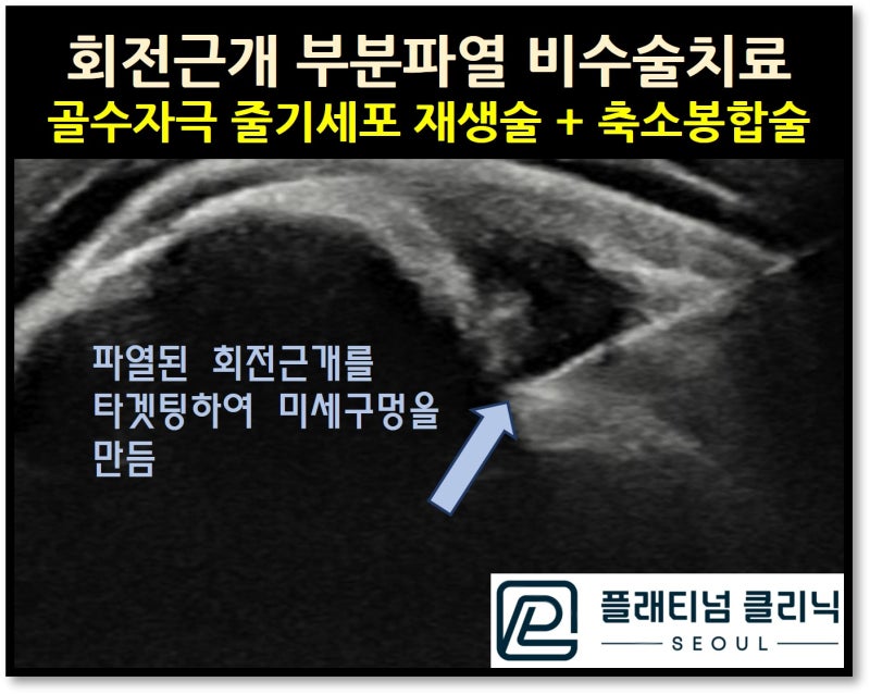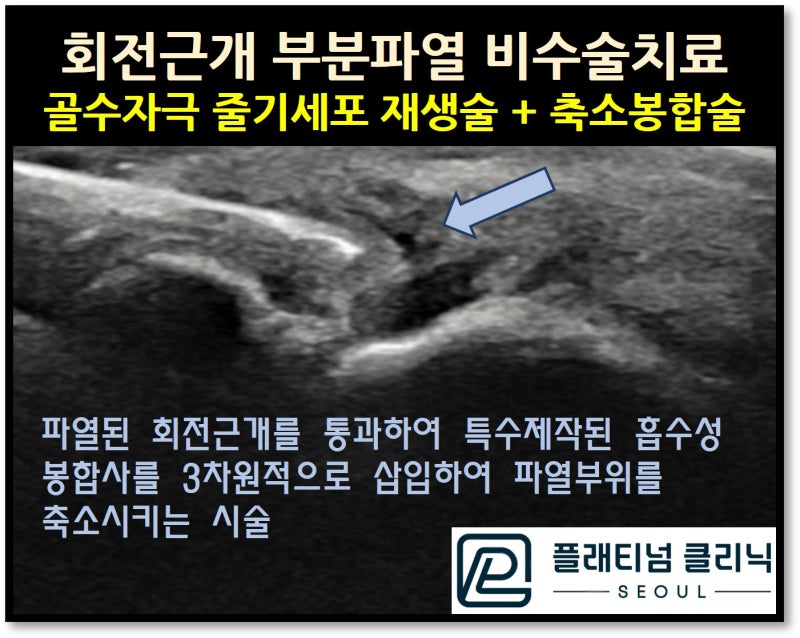 초음파검사를 하니 극상근 부위의 부분파열이 심하게 진행되어 있었습니다. 거의 전층파열에 가까울 정도로 너덜너덜하게 파열이 되어 있었습니다. 주사치료를 할때 초음파를 분명 보면서 했을 텐데 이런 파열을 수년간 주사만 놓다니........ 회전근개 파열은 진행하는 질환입니다. 이전에도 설명드렸지만 힘줄이란 근육과 뼈를 연결해 주는 구조물이기 때문에 점점 더 진행할 수 밖에 없는 질환입니다. 초기에 주사치료를 잘 해서 조직이 치유가 되면 정말 좋지만 그렇지 않은 경우 주사치료를 계속하는 것은 환자분께 시간적, 금전적 손해는 물론이거니와 조직이 퇴행성 변화가 더 진행되면서 질병이 더 악화되어 치료 결과가 좋지 않을 수 있습니다. 다시 환자분 이야기로 돌아가서. 부분 파열의 정도가 꽤 심하고 가동범위제한이 심해서 보다 침투적으로 치료를 결정했습니다. 부분파열이 심하거나 주사치료등 보전적 치료에도 호전되지 않을 경우 할 수 있는 치료. 시술입니다. 바로 골수자극 줄기세포 재생술 과 축소 봉합술 입니다. 아래 링크에 자세히 설명하였습니다. https://blog.naver.com/9690067/223251719566