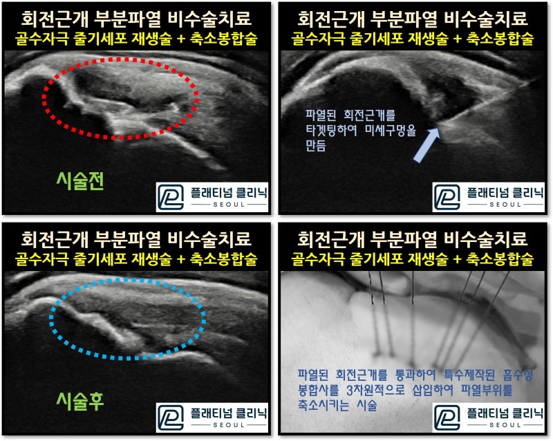 전체적으로 다시 보면 시술전 검게 보이면서 너덜거리던 회전근개 부분파열이 골수자극 줄기세포 재생술 과 축소봉합술 후 하얗게 복원된 것이 관찰됩니다. 회전근개 질환은 먼저 정확하게 진단을 먼저 하는 것이 중요합니다. 가끔 환자분들이 자기가 왜 아픈지, 진단이 뭐지 모르시는 경우가 많고 여러병원에서 다른 진단을 받았다고 헷갈리신다고 하시면서 저한테 오시는 경우가 많습니다. 정확하게 진단을 먼저해야 치료방향을 세울 수 있습니다. 치료를 하다 호전되지 않는다면 과감하게 보다 침투적으로 치료해야 합니다. 치료시기를 놓쳐서 너무 늦어지면 호미로 막을 수 있는 것을 가래로 막아야 할 경우가 발생하게 됩니다. 다행이 이 환자분은 완전파열로 진행되기 전에 저한테 오셔서 수술 없이 치료 될 수 있었습니다.