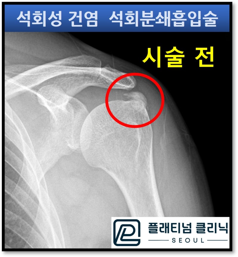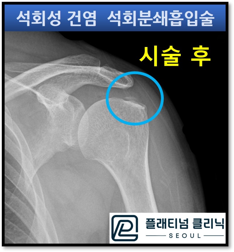 시술 후 X-ray 를 보면 원안에 하얗고 커다랗게 보이던 석회가 거의 제거된 것이 관찰됩니다.