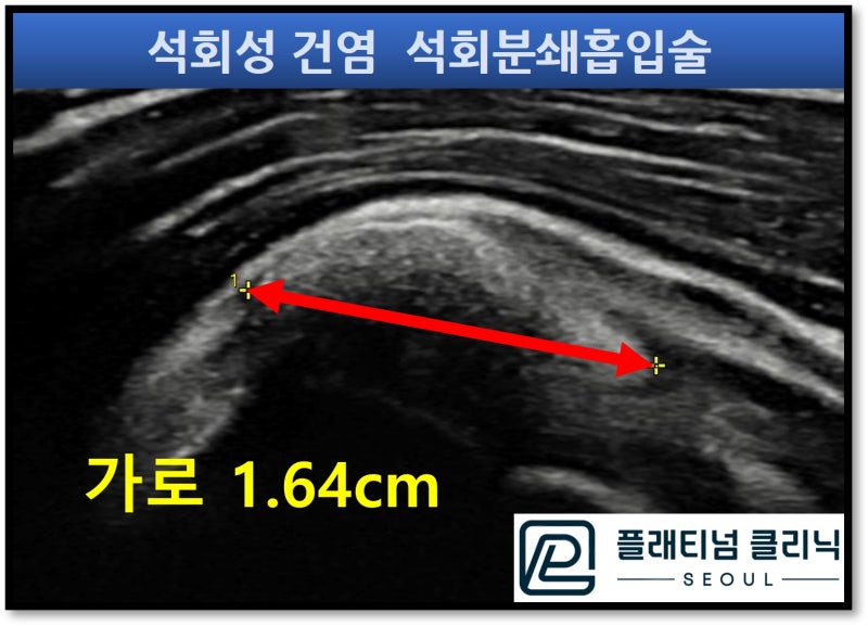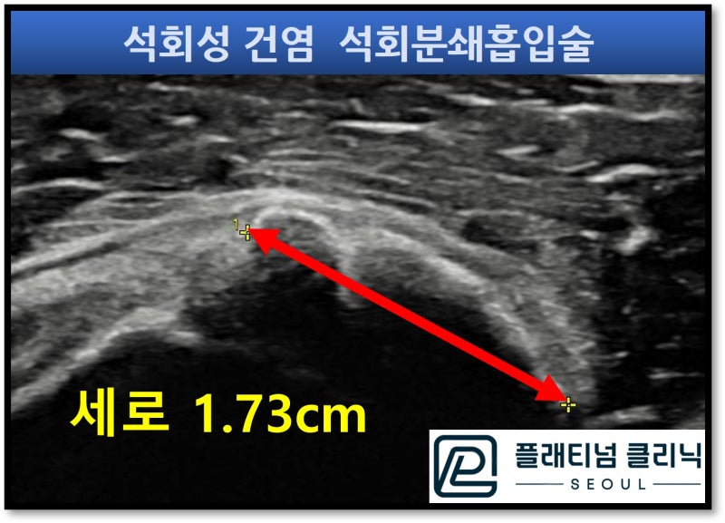 초음파로 석회의 크기와 양상을 체크하였습니다. 가로*세로 1.64*1.73cm 크기의 커다란 석회가 관찰되었으며 약간 찐득한 양상의 석회가 관찰되었습니다. 석회를 비수술적으로 치료하고 싶은데 가능하냐고 하셨고 다음날 진료가 있어서 팔을 사용해야 하는데 가능하지를 문의해 주셨습니다. 시술에 의한 통증은 있을 수 있지만 진료나 시술하시는데 지장이 없을 것으로 설명하고 시술을 진행하였습니다. 석회분쇄흡입술을 통해 석회를 제거하였습니다.