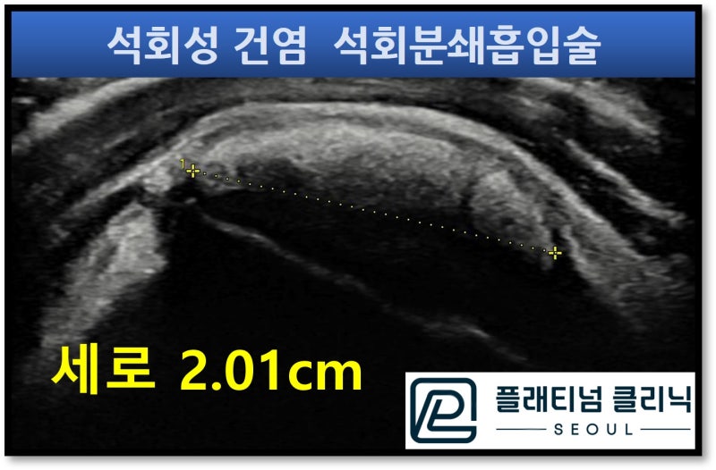 가로 * 세로 2.66*2.01cm 크기의 어마어마한 석회가 관찰됩니다. 동양인 기준으로 극상근의 폭은 2.5~3.0cm 정도 되는데 극상근의 거의 전체에 석회가 있는 것입니다. 환자분은 너무너무 고통이 심하여 팔을 움직일 수도 없을 정도 였습니다. 타병원에서 석회 뽑는 주사 시술을 했다고 했지만 제거되지 않았고 너무 커서 수술을 해야 한다고 이야기를 들었다고 하십니다. 이전에도 말씀드렸지만 석회성 건염은 수술없이 치료 될 수 있는 질환입니다. 석회분쇄흡입술을 시행하였습니다.