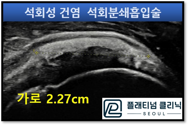초음파로 크기와 양상을 확인해 보았습니다. 가로*세로 2.27*3.33cm 크기의 어마어마한 석회과 관찰되고 석회의 모양이 다 관찰되는 찐득한 양상의 석회로 판단됩니다. 며칠 뒤 영국으로 다시 돌아가셔야 하고 빠른 치료를 원하셔서 석회를 비수술적으로 제거하는 석회분쇄흡입술을 진행하였습니다. 석회분쇄흡입술은 아래 링크를 보시면 자세히 설명하였습니다. https://blog.naver.com/9690067/223461116411