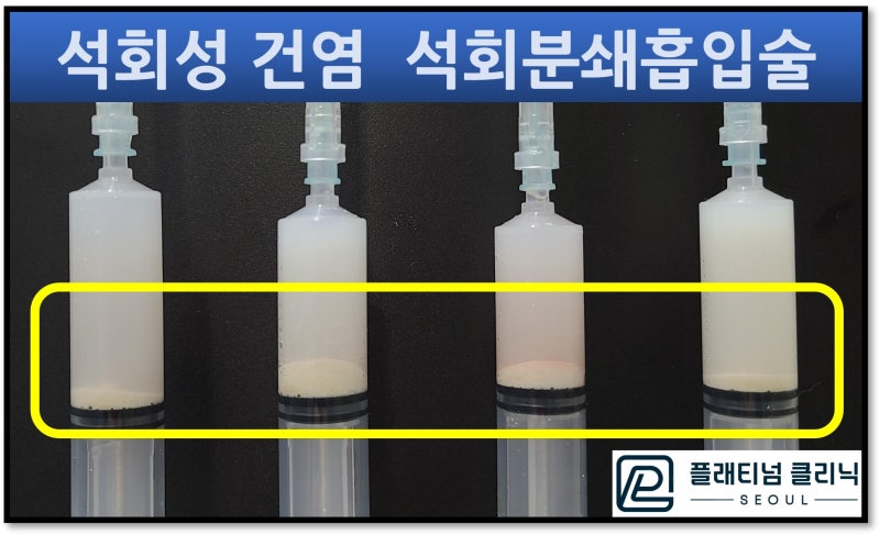 🔗 https://blog.naver.com/9690067/223461116411영상을 보시면 삽입된 주사기 내로 분쇄된 석회가 흡입되어 나오는 것이 관찰됩니다. 투명했던 주사기가 점점 분쇄된 석회로 채워지면서 점점 뿌옇게 변하는 것이 관찰됩니다. 석회를 특수제작된 가이드와 드릴을 이용하여 분쇄하고 생리식염수를 이용하여 흡입해 내는 시술이며 이를 반복적으로 시행하게 됩니다.
