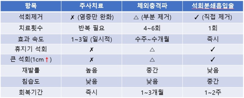 문제는 휴지기 석회입니다. 딱딱하게 굳어진 석회는 자연 흡수가 거의 안 되며, 주사나 충격파로도 제거가 어렵습니다. ────────────────────────────────────────────────── 치료 방법 3가지 완벽 비교 1️⃣ 스테로이드 주사치료 원리: • 석회 주변 염증 완화 • 통증 감소 목적 장점: • 빠른 통증 완화 (1~3일) • 비침습적 • 외래에서 즉시 시행 가능 단점: • 석회 자체는 제거 안 됨 • 일시적 효과 (2~4주) • 재발 가능성 높음 • 반복 주사 시 힘줄 약화 위험 적합한 경우: • 흡수기 석회 (부드러운 석회) • 통증이 심하지 않음 • 석회 크기가 작음 (0.5cm 이하)
