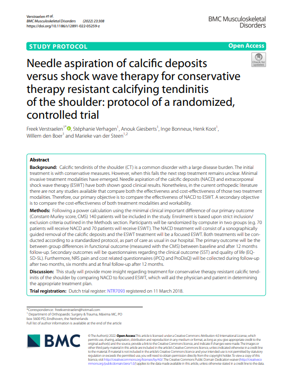▲ BMC Musculoskelet Disord 2022 - 바늘 흡입술 vs 충격파 결과 비교 ────────────────────────────────────────────────── 📊 연구 2: 초음파 유도 바늘 치료 vs 고에너지 충격파 출처: Arthroscopy. 2020 연구 프로토콜: • 초음파 유도 바늘 치료(UGN): 1회 시술 + 스테로이드 주사 • 고에너지 체외충격파(ESWT): 4회 세션 (주 1회, 0.35 mJ/mm², 2000 펄스) 결과: • UGN: 1회로 완료, 빠른 통증 완화 • ESWT: 4주 소요, 점진적 개선