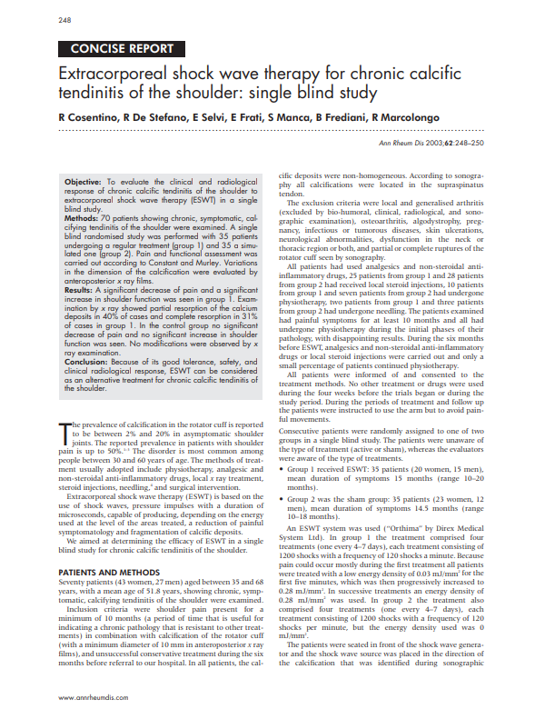 ▲ Ann Rheum Dis 2003 - ESWT 안전성 및 효과 ────────────────────────────────────────────────── 📊 연구 4: 관절경 수술 vs 체외충격파 출처: PMC. 2009 연구 내용: • 만성 석회성건염에서 ESWT와 관절경 수술 비교 • 많은 연구에서 ESWT가 좋은 결과 결론: • 관절경 수술 전 ESWT 또는 바늘 치료 시도 권장 • 수술은 최후 수단