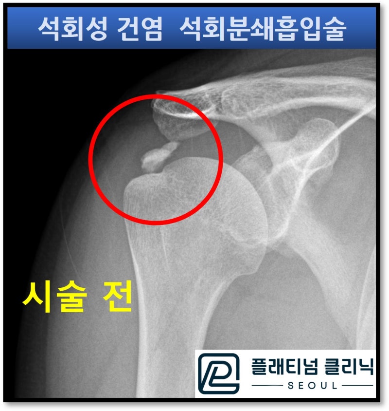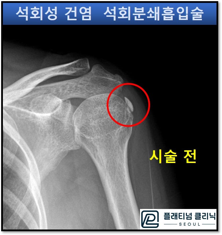 ▲ PMC 2009 - 관절경 수술 vs 충격파 비교 ────────────────────────────────────────────────── 실제 환자 사례 📋 사례 1: 주사치료만 반복하다 악화된 경우 환자 정보 • 45세 여성, 사무직 • 주증상: 야간통, 팔을 들 때 찌릿한 통증 • 증상 기간: 8개월 타병원 치료 이력 타병원에서 석회성건염 진단 후 3개월간 스테로이드 주사 3회 시행. 처음에는 통증이 완화되었으나 2~3주 후 재발 반복. "석회가 흡수될 때까지 기다리자"는 소견 들음. 플래티넘의원 검사 소견 • 초음파 검사: 극상건(supraspinatus tendon)에 1.2cm 크기 석회 침착 • 석회 단계: 휴지기(resting phase) - 딱딱하고 경계 명확 • X-ray: 밀도 높은 석회 확인