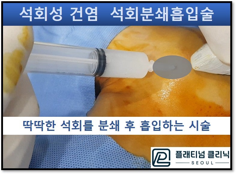▲ 체외충격파치료(ESWT) - 4~6회 반복 치료 필요 📌 논문 근거: Arthroscopy. 2020 • 고에너지 ESWT: 0.35 mJ/mm², 2000 펄스, 주 1회, 총 4회 • 보존적 치료 실패 환자에서 좋은 결과 ────────────────────────────────────────────────── 3️⃣ 석회분쇄흡입술 (Needle Aspiration) 원리: • 초음파 유도하에 석회 직접 진입 • 특수 바늘로 석회 분쇄 • 세척 및 흡입으로 즉시 제거 치료 프로토콜: • 1회 시술로 완료 • 시술 시간: 15~30분 • 당일 입원/퇴원 가능 장점: • 1회로 즉시 효과 • 모든 단계(형성기/휴지기/흡수기) 제거 가능 • 큰 석회(1.5cm 이상)도 제거 가능 • 재발률 낮음 단점: • 침습적 (바늘 삽입) • 시술 후 1~2주 통증 가능 • 숙련된 의사 필요 적합한 경우: • 휴지기 석회 (딱딱한 석회) • 석회 크기 1cm 이상 • 주사·충격파 효과 없었던 경우 • 빠른 일상 복귀 원하는 경우